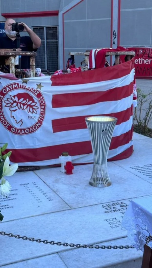 Το τρόπαιο του Conference League πήγε στο μνημείο έξω από το “Γ. Καραϊσκάκης”, αφιερωμένο στα θύματα της τραγωδίας της Θύρας 7.
