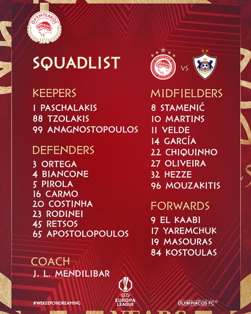 Ο Ολυμπιακός ολοκλήρωσε την προετοιμασία του για το κρίσιμο παιχνίδι της Πέμπτης (30/01, 22:00) κόντρα στην Καραμπάγκ στο «Γ. Καραϊσκάκης» για την 8η και τελευταία αγωνιστική της League Phase του Europa League. Οι «ερυθρόλευκοι» έχουν εξασφαλίσει την παρουσία τους στα playoffs μετά τη μεγάλη νίκη επί της Πόρτο και πλέον στοχεύουν στο βήμα προς την οκτάδα της διοργάνωσης.