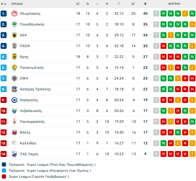 Ο Ολυμπιακός διατήρησε την πρωτοκαθεδρία του στη Super League, επικρατώντας με 2-1 του Άρη στο «Γ. Καραϊσκάκης». Με πρωταγωνιστή τον Μπάμπη Κωστούλα, που σημείωσε και τα δύο γκολ της ανατροπής στο δεύτερο ημίχρονο, οι Πειραιώτες έδειξαν χαρακτήρα και εξασφάλισαν πολύτιμους τρεις βαθμούς. Η νίκη αυτή διατήρησε τον Ολυμπιακό στο +5 από τον δεύτερο Παναθηναϊκό, αυξάνοντας την πίεση στους ανταγωνιστές του.