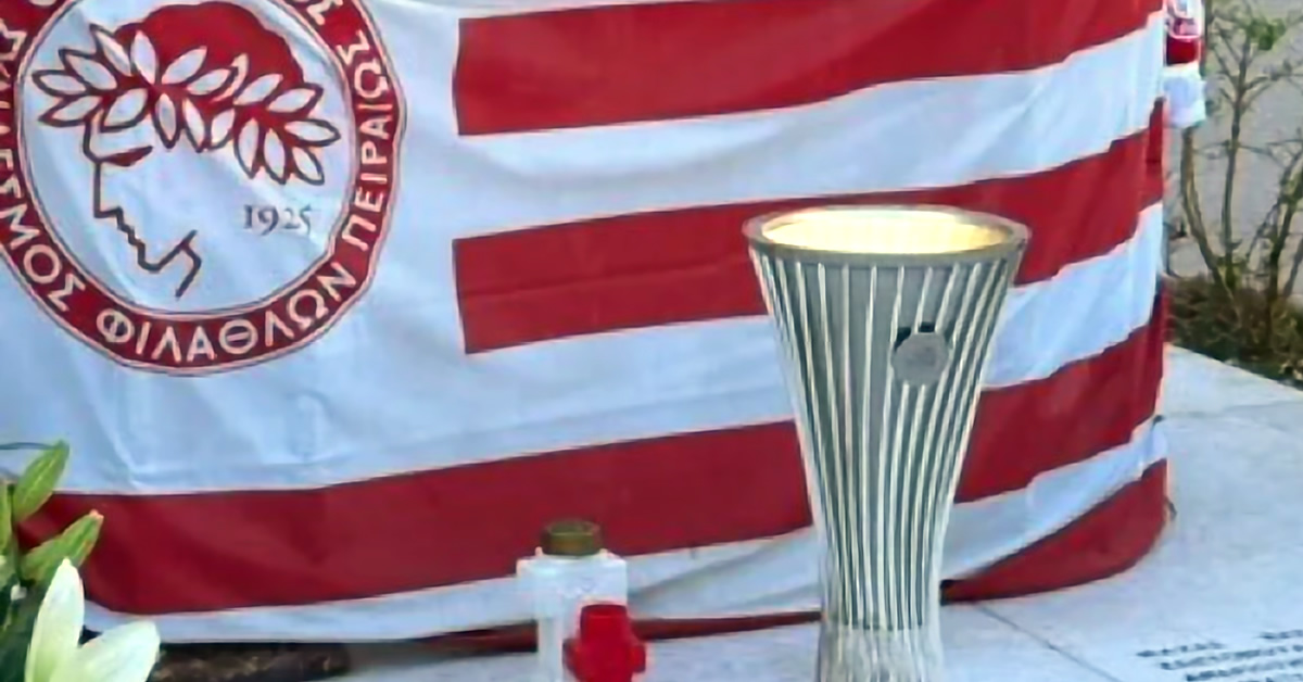 Το τρόπαιο του Conference League πήγε στο μνημείο έξω από το “Γ. Καραϊσκάκης”, αφιερωμένο στα θύματα της τραγωδίας της Θύρας 7.