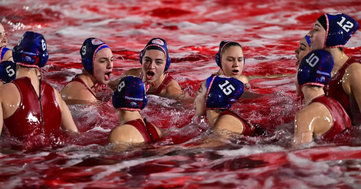 Οι παίκτριες του Ολυμπιακού πανηγυρίζουν σε αγώνα του Champions League πόλο γυναικών