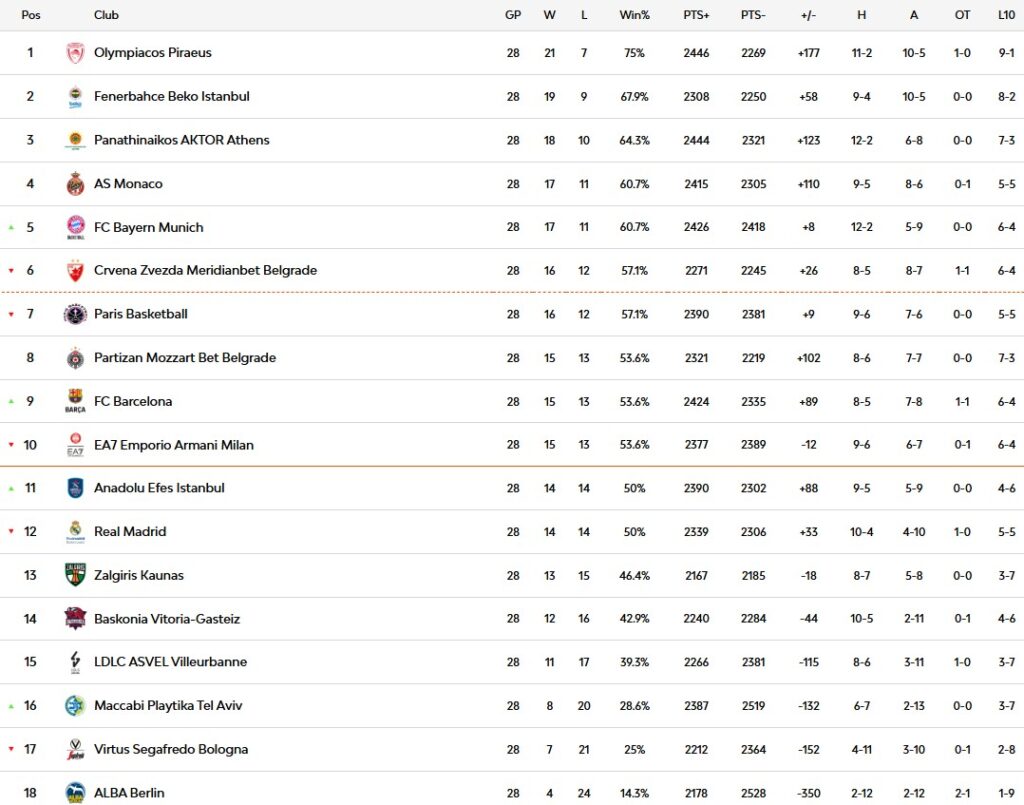 Δείτε την βαθμολογία της 28ης αγωνιστικής της Euroleague
