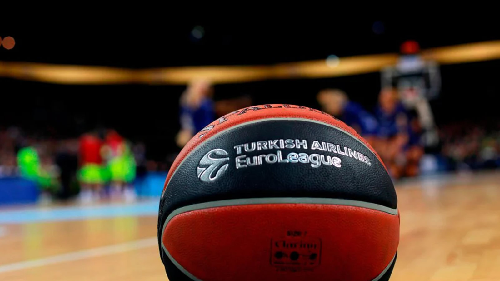 Το σήμα της EuroLeague σε μπασκετική μπάλα με φόντο το παρκέ