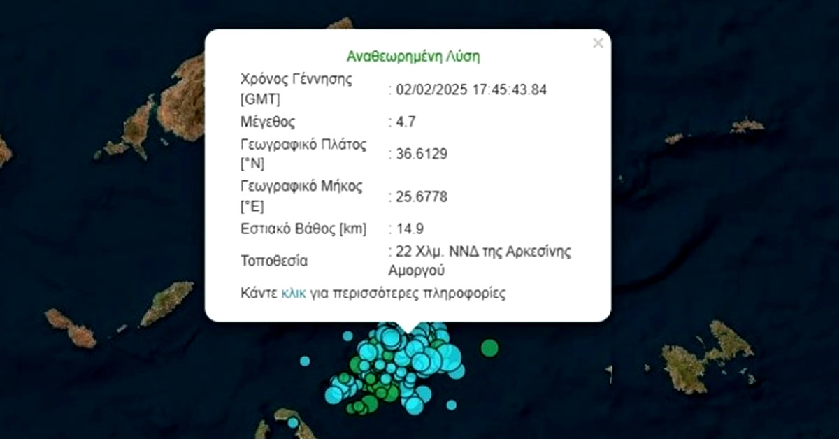 Η σεισμική δραστηριότητα στη Σαντορίνη συνεχίζεται με αμείωτη ένταση, καθώς το βράδυ της Παρασκευής (2/2), στις 19:45, σημειώθηκε ακόμη ένας σεισμός 4,7 Ρίχτερ. Σύμφωνα με το Γεωδυναμικό Ινστιτούτο, το εστιακό βάθος του σεισμού ήταν 14,9 χιλιόμετρα, με το επίκεντρο να εντοπίζεται στη θαλάσσια περιοχή μεταξύ Σαντορίνης και Αμοργού.