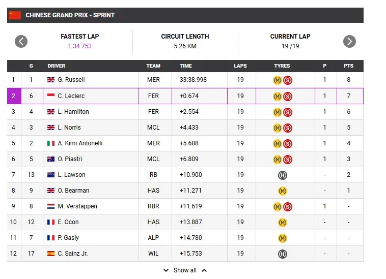 Το Sprint στην ηλιόλουστη Σαγκάη χάρισε έντονες συγκινήσεις από την αρχή. Οι οδηγοί της Ferrari εκκίνησαν εξαιρετικά. Ο Ράσελ κράτησε αρχικά την πρωτοπορία από την pole position, αλλά γρήγορα ξεκίνησε μια υπέροχη μάχη με τον Χάμιλτον, αλλάζοντας διαρκώς θέσεις στην κορυφή.
