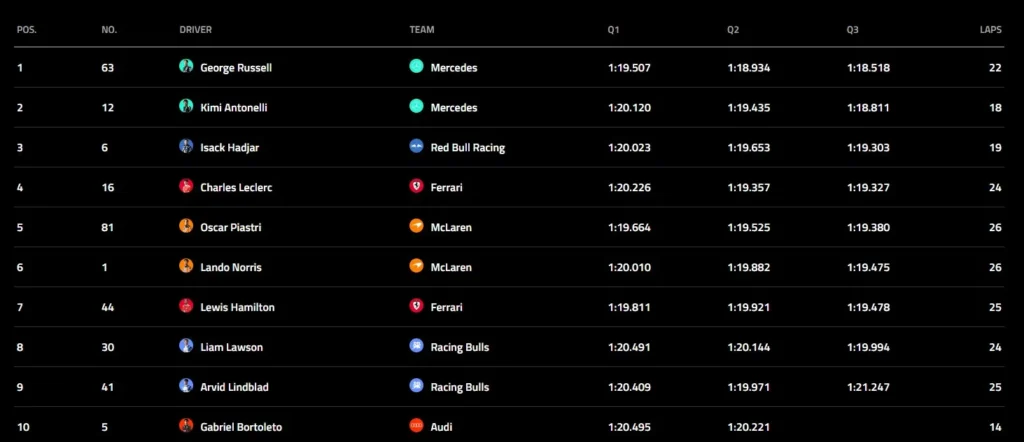 Στη μάχη των… θνητών, ο Ιζάκ Χατζάρ με τη Red Bull κατέλαβε την τρίτη θέση, όντας αδύνατον να απειλήσει τις ταχύτατες Mercedes. Πίσω του ακολούθησαν ο Σαρλ Λεκλέρ με τη Ferrari και ο Όσκαρ Πιάστρι με τη McLaren, συμπληρώνοντας την πρώτη πεντάδα του grid.