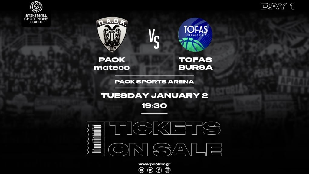 «Η ΚΑΕ ΠΑΟΚ mateco ανακοινώνει ότι από σήμερα το πρωί ξεκίνησε η διάθεση των εισιτηρίων για τον αγώνα ΠΑΟΚ mateco – Tofas Bursa, που θα διεξαχθεί στο PAOK Sports Arena την Τρίτη 2 Ιανουαρίου 2024 στις 19:30, για τα Play-Ins του Basketball Champions League.