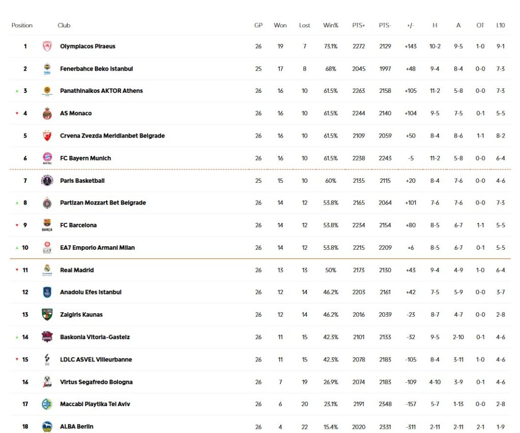 Στην τρίτη θέση ισοβαθμούν ο Παναθηναϊκός, η Μονακό, ο Ερυθρός Αστέρας και η Μπάγερν, όλοι με 16-10, δημιουργώντας ένα εξαιρετικά ανταγωνιστικό σκηνικό ενόψει της τελικής ευθείας της regular season.