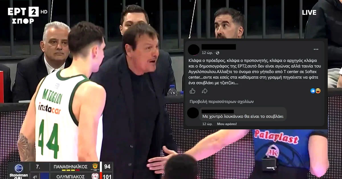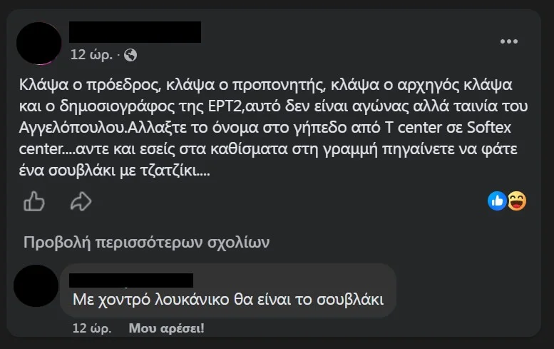 Το αποκορύφωμα της διαδικτυακής καζούρας ήρθε με την ξεκαρδιστική πρόταση για άμεση μετονομασία του γηπέδου. Ο δημιουργός του post πρότεινε να αλλάξει η ταμπέλα από κλειστό των Ολυμπιακών Εγκαταστάσεων σε… Softex Center, τρολάροντας αλύπητα την ατελείωτη «κλάψα» των ηττημένων. Τέλος, δεν παρέλειψε να ρίξει τα βέλη του και στους θεατές των ακριβών θέσεων δίπλα ακριβώς στο παρκέ, προτρέποντάς τους με περίσσιο χιούμορ να πάνε για ένα… σουβλάκι με τζατζίκι αντί να κάθονται στη γραμμή του αγωνιστικού χώρου.
